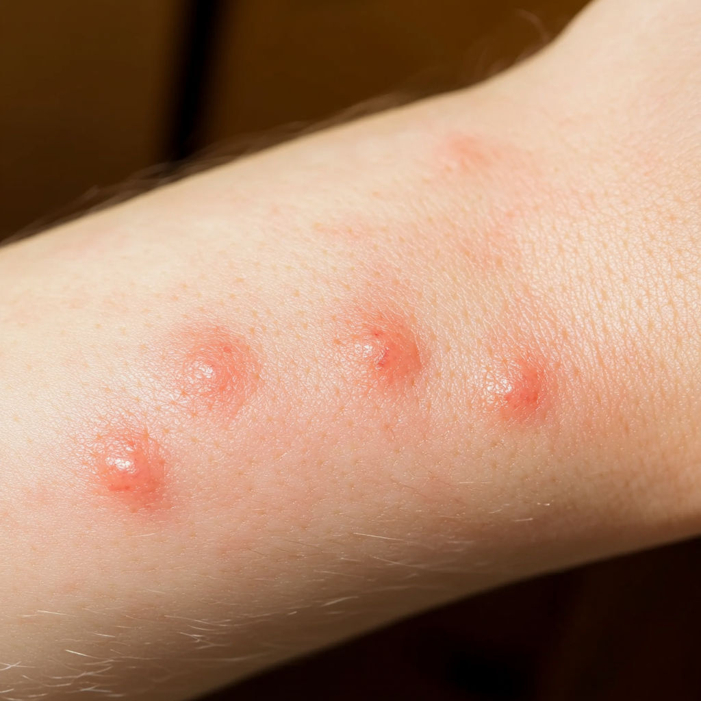 Bed Bug Bite: Bed bugs usually leave a series of bites on exposed skin (arms, neck, face). The bites appear as red, swollen spots with mild itching that can intensify over hours or days.