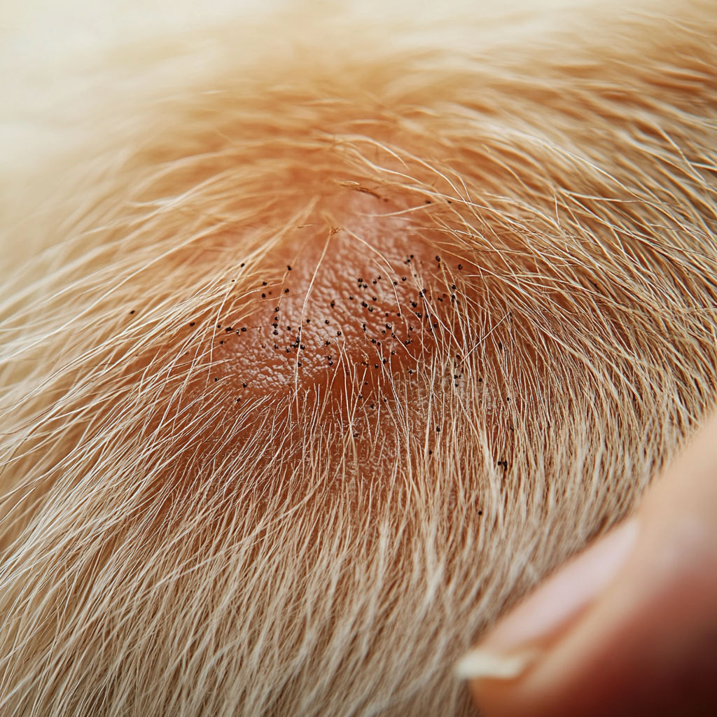 Fleas on the skin can be recognized by itching and visible bites. The bites often appear as small, red spots. Flea droppings can also be seen as black dots. Inspecting the environment is important to identify an infestation.