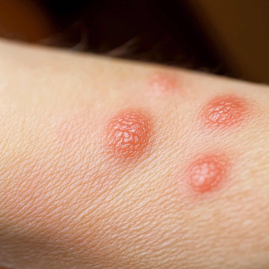 Bed Bug Bite: Bed bugs usually leave a series of bites on exposed skin (arms, neck, face). The bites appear as red, swollen spots with mild itching that can intensify over hours or days.
