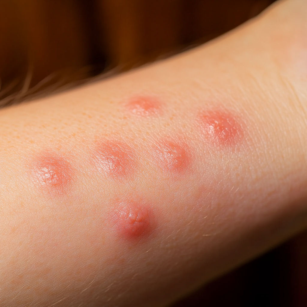Bed Bug Bite: Bed bugs usually leave a series of bites on exposed skin (arms, neck, face). The bites appear as red, swollen spots with mild itching that can intensify over hours or days.