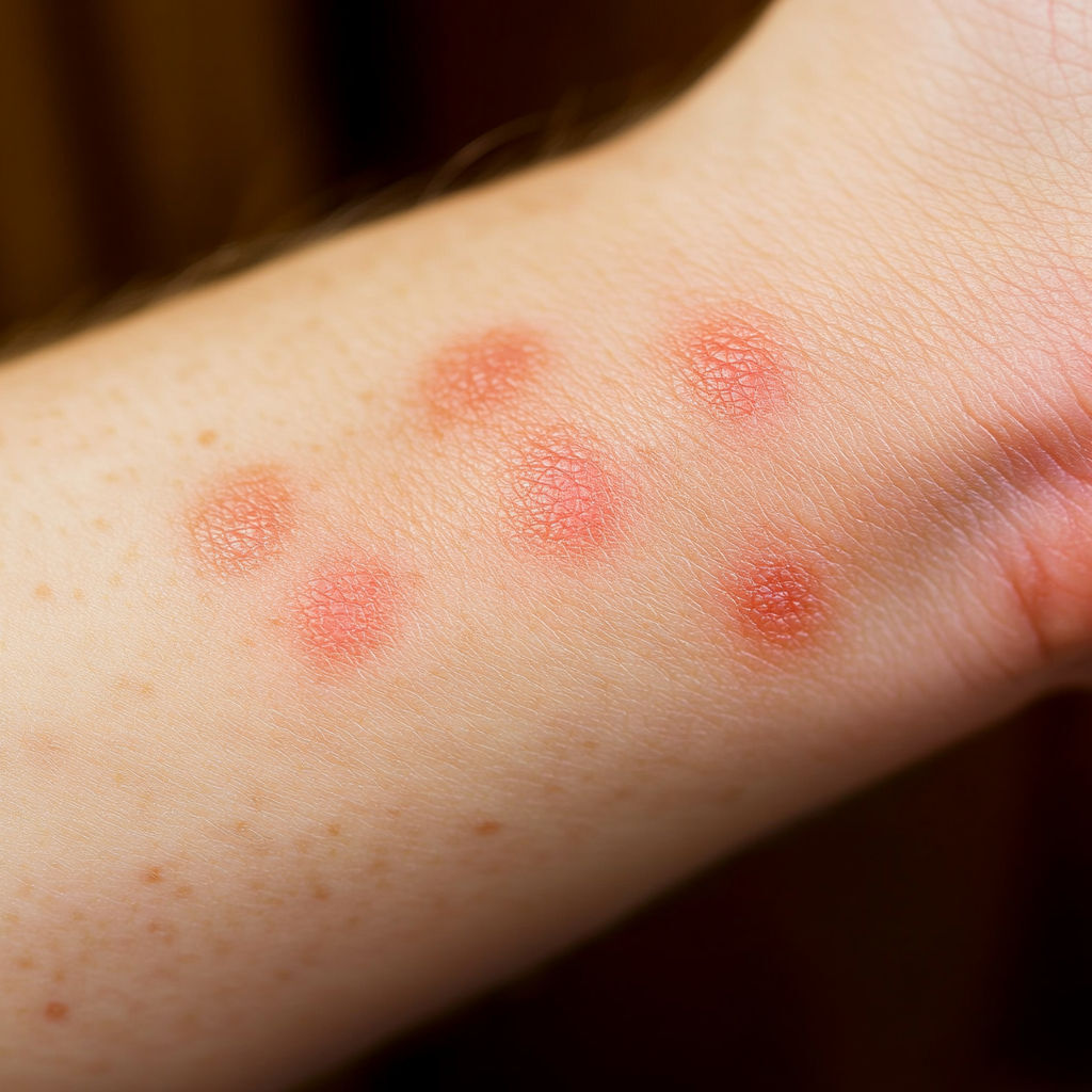 Bed Bug Bite: Bed bugs usually leave a series of bites on exposed skin (arms, neck, face). The bites appear as red, swollen spots with mild itching that can intensify over hours or days.