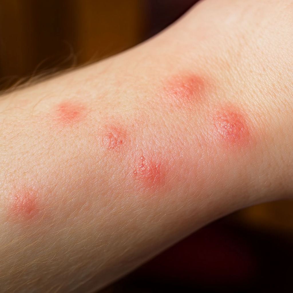 Bed Bug Bite: Bed bugs usually leave a series of bites on exposed skin (arms, neck, face). The bites appear as red, swollen spots with mild itching that can intensify over hours or days.
