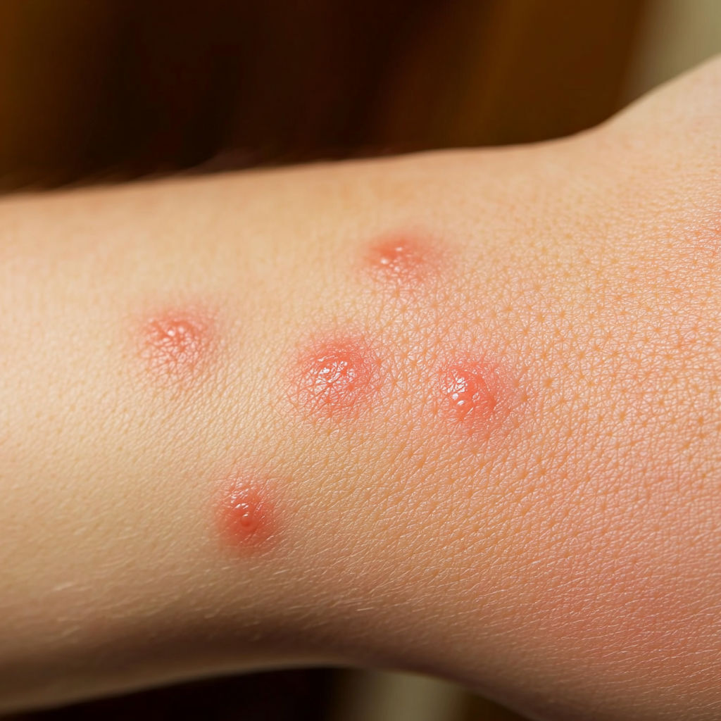 Bed Bug Bite: Bed bugs usually leave a series of bites on exposed skin (arms, neck, face). The bites appear as red, swollen spots with mild itching that can intensify over hours or days.