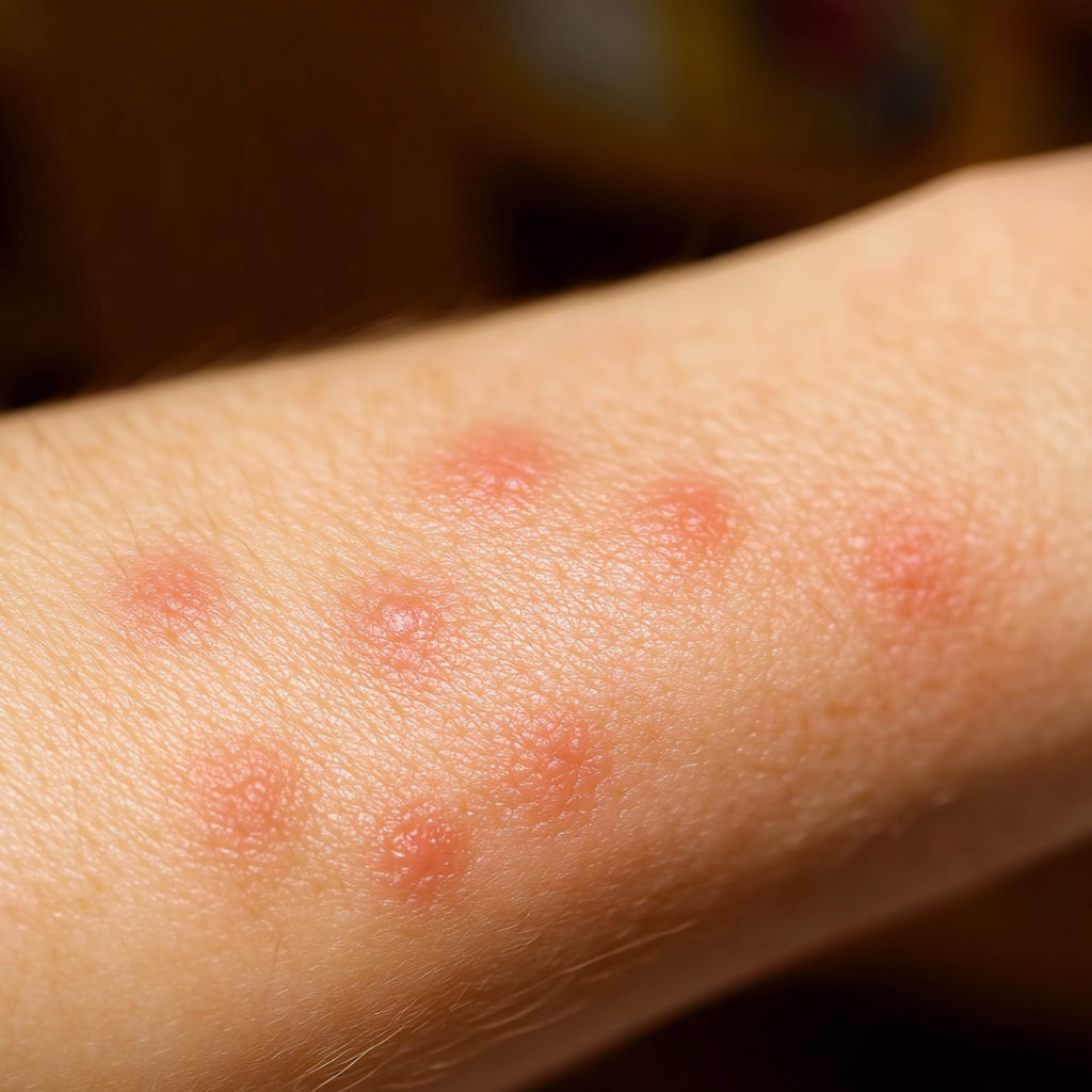 Bed Bug Bite: Bed bugs usually leave a series of bites on exposed skin (arms, neck, face). The bites appear as red, swollen spots with mild itching that can intensify over hours or days.