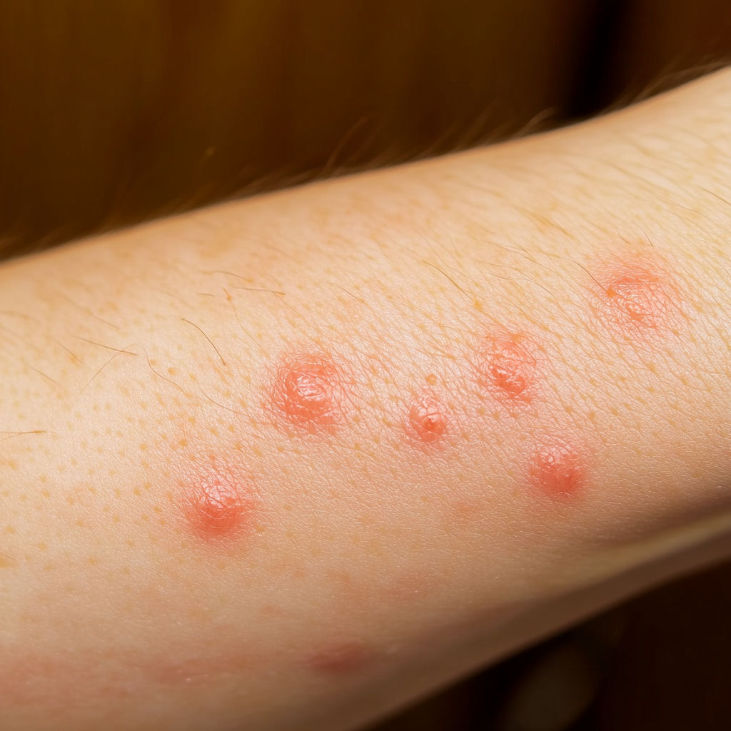 Bed Bug Bite: Bed bugs usually leave a series of bites on exposed skin (arms, neck, face). The bites appear as red, swollen spots with mild itching that can intensify over hours or days.