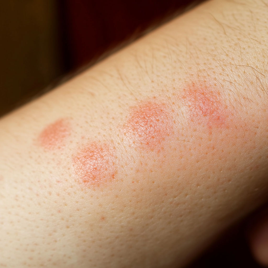 Bed Bug Bite: Bed bugs usually leave a series of bites on exposed skin (arms, neck, face). The bites appear as red, swollen spots with mild itching that can intensify over hours or days.