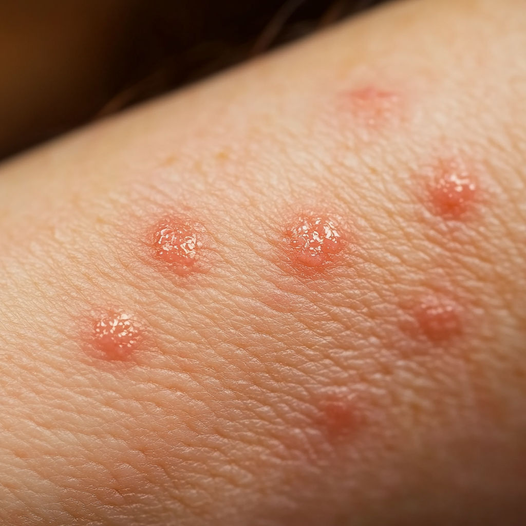 Bed Bug Bite: Bed bugs usually leave a series of bites on exposed skin (arms, neck, face). The bites appear as red, swollen spots with mild itching that can intensify over hours or days.