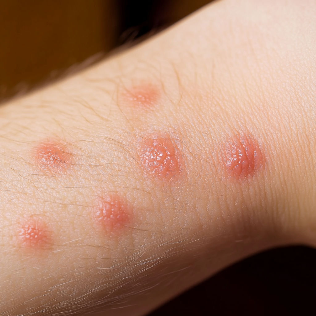 Bed Bug Bite: Bed bugs usually leave a series of bites on exposed skin (arms, neck, face). The bites appear as red, swollen spots with mild itching that can intensify over hours or days.