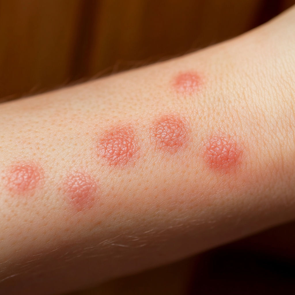Bed Bug Bite: Bed bugs usually leave a series of bites on exposed skin (arms, neck, face). The bites appear as red, swollen spots with mild itching that can intensify over hours or days.
