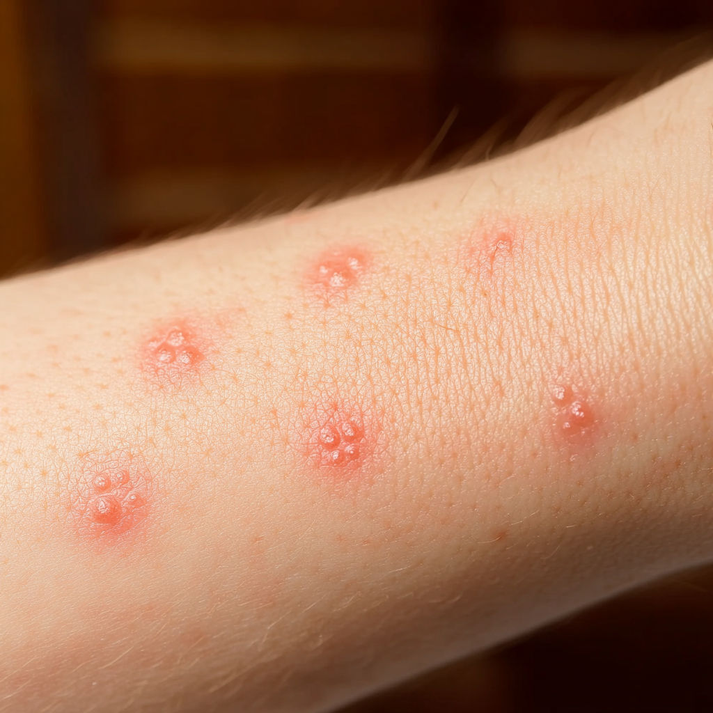 Bed Bug Bite: Bed bugs usually leave a series of bites on exposed skin (arms, neck, face). The bites appear as red, swollen spots with mild itching that can intensify over hours or days.