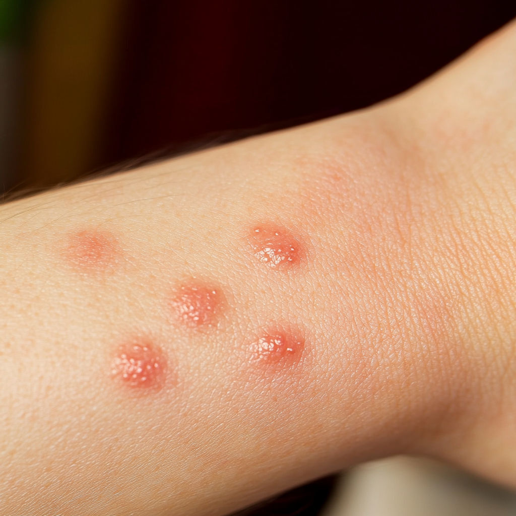 Bed Bug Bite: Bed bugs usually leave a series of bites on exposed skin (arms, neck, face). The bites appear as red, swollen spots with mild itching that can intensify over hours or days.