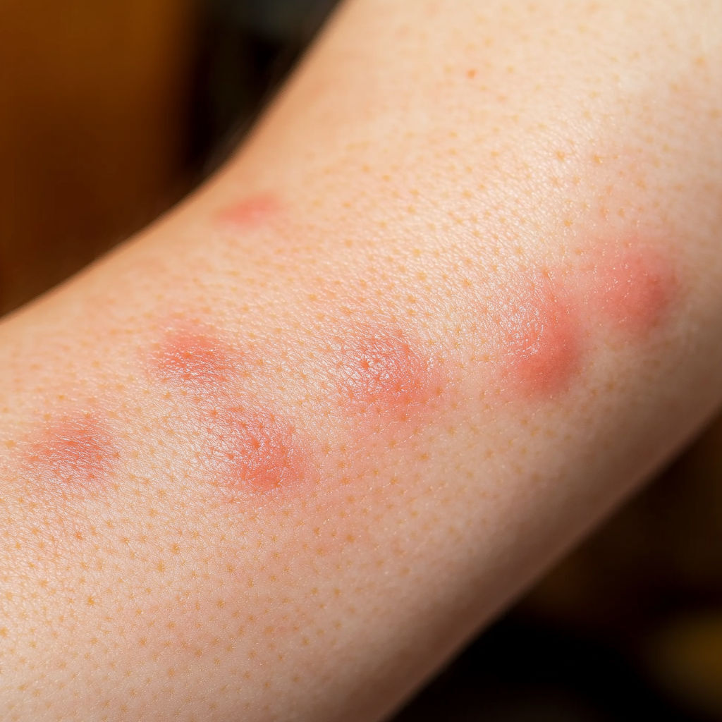 Bed Bug Bite: Bed bugs usually leave a series of bites on exposed skin (arms, neck, face). The bites appear as red, swollen spots with mild itching that can intensify over hours or days.