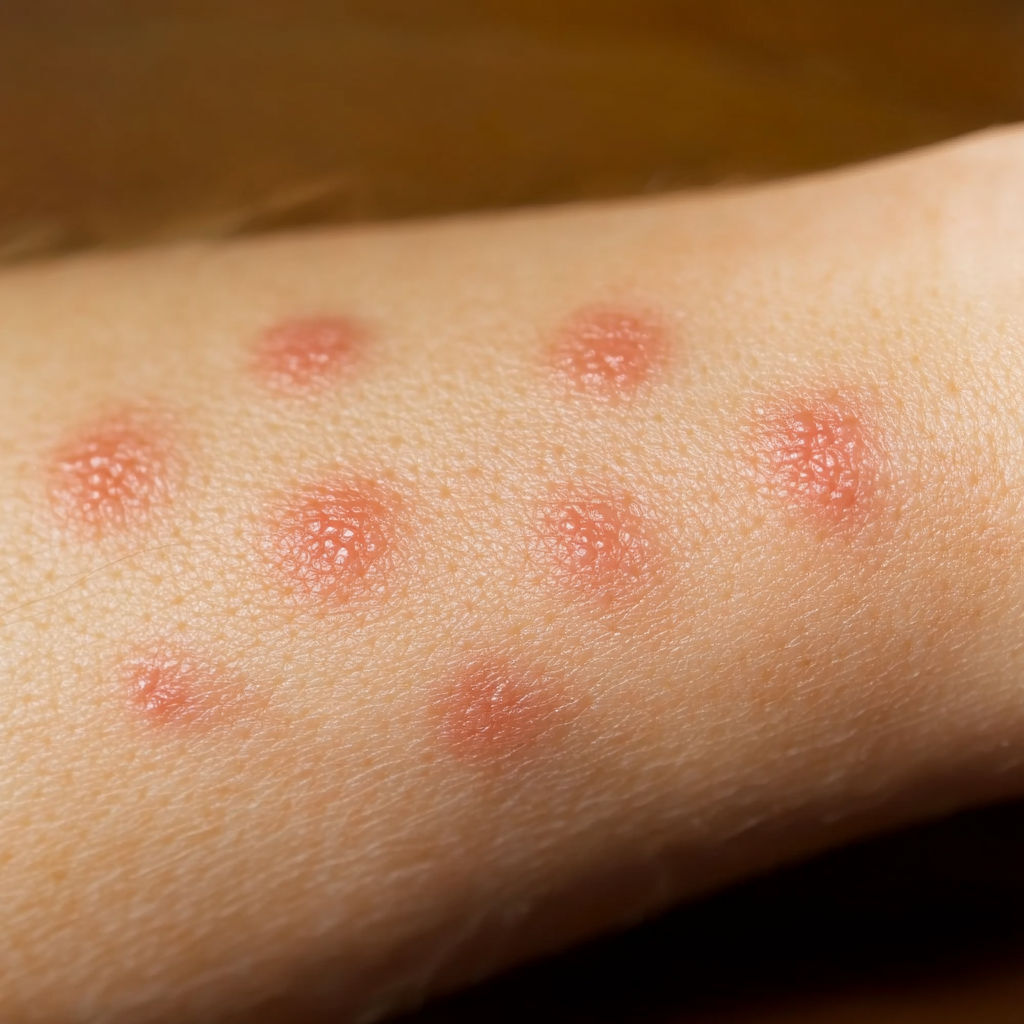 Bed Bug Bite: Bed bugs usually leave a series of bites on exposed skin (arms, neck, face). The bites appear as red, swollen spots with mild itching that can intensify over hours or days.