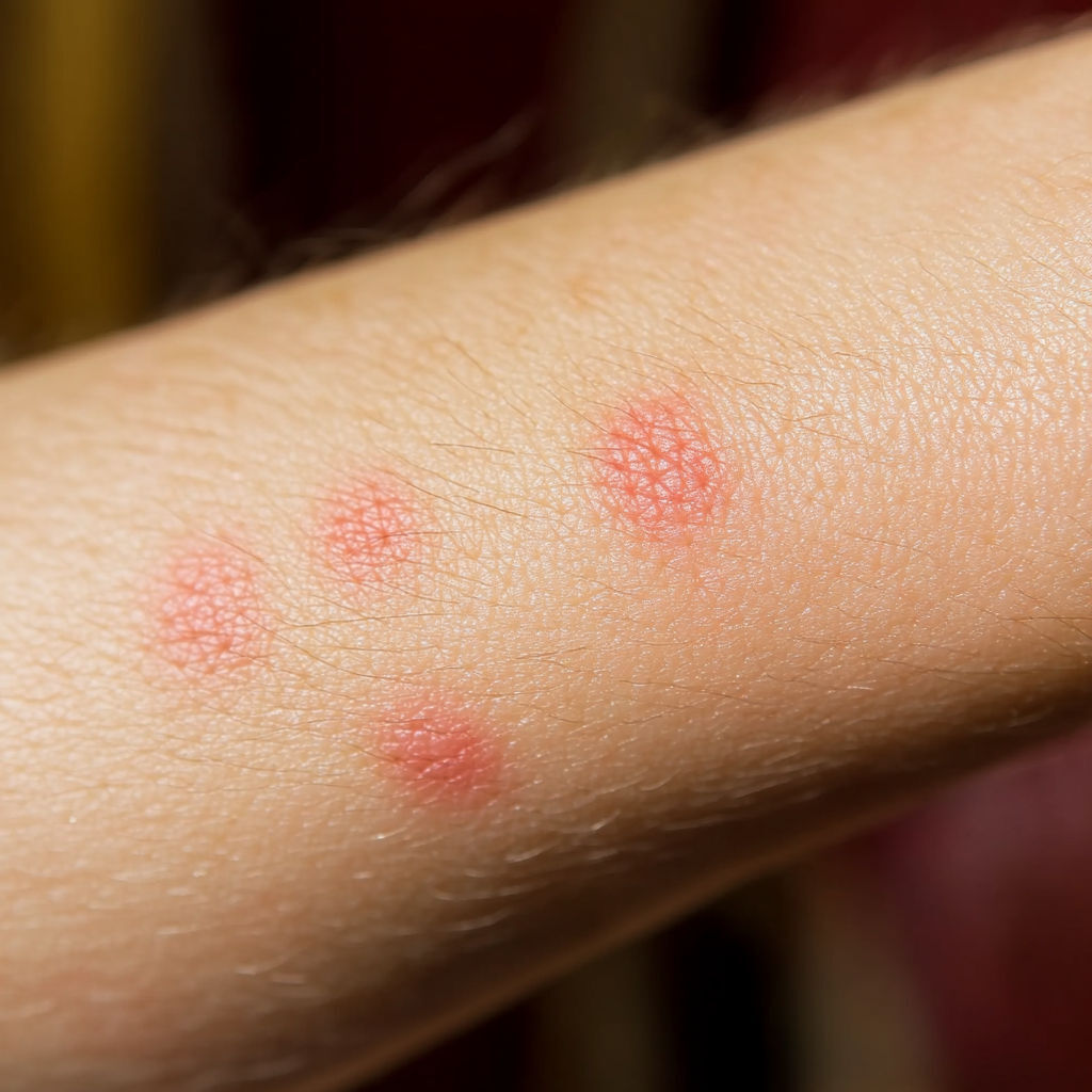 Bed Bug Bite: Bed bugs usually leave a series of bites on exposed skin (arms, neck, face). The bites appear as red, swollen spots with mild itching that can intensify over hours or days.