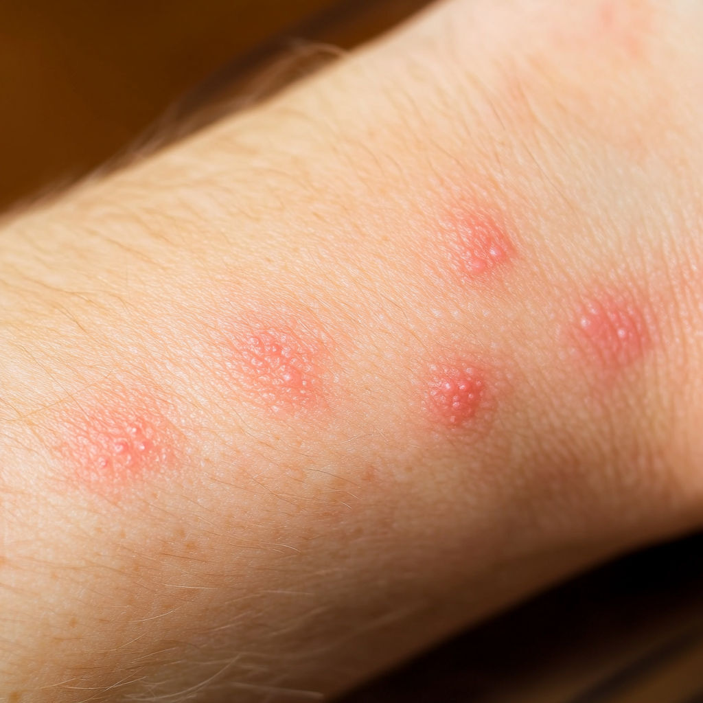 Bed Bug Bite: Bed bugs usually leave a series of bites on exposed skin (arms, neck, face). The bites appear as red, swollen spots with mild itching that can intensify over hours or days.