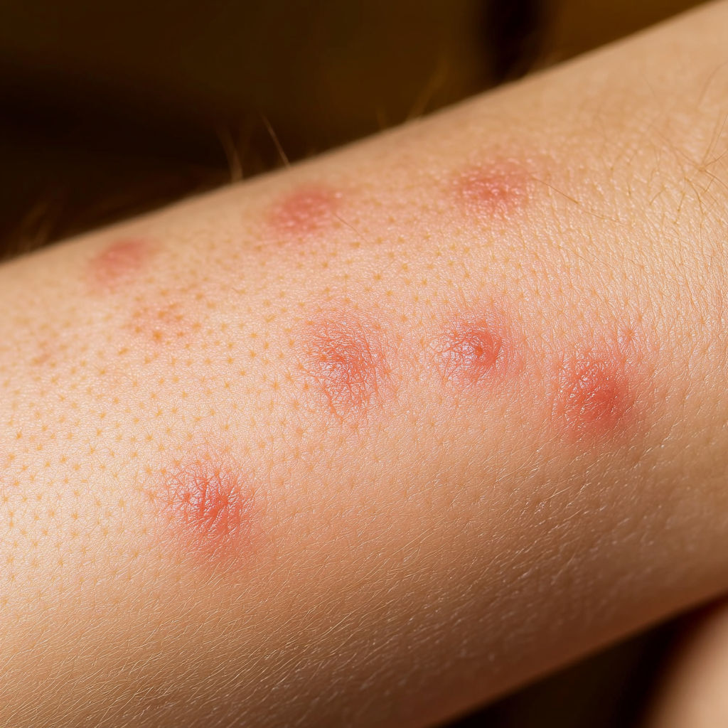 Bed Bug Bite: Bed bugs usually leave a series of bites on exposed skin (arms, neck, face). The bites appear as red, swollen spots with mild itching that can intensify over hours or days.