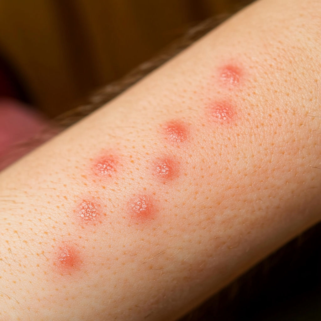 Bed Bug Bite: Bed bugs usually leave a series of bites on exposed skin (arms, neck, face). The bites appear as red, swollen spots with mild itching that can intensify over hours or days.