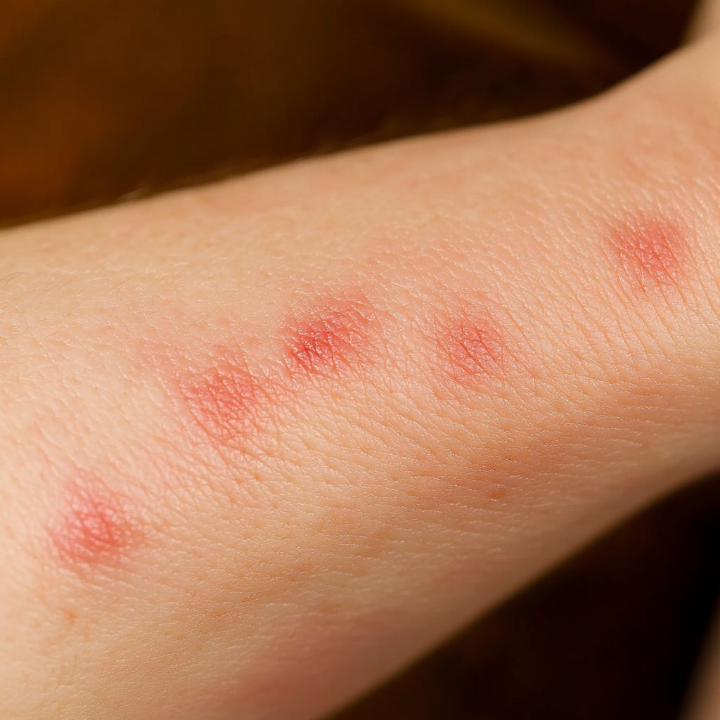 Bed Bug Bite: Bed bugs usually leave a series of bites on exposed skin (arms, neck, face). The bites appear as red, swollen spots with mild itching that can intensify over hours or days.