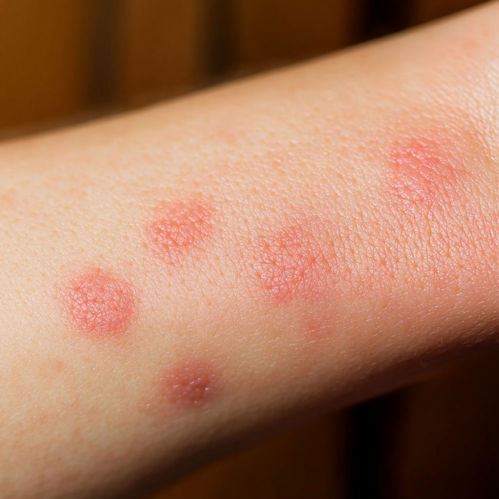 Bed Bug Bite: Bed bugs usually leave a series of bites on exposed skin (arms, neck, face). The bites appear as red, swollen spots with mild itching that can intensify over hours or days.