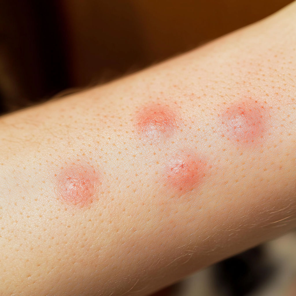 Bed Bug Bite: Bed bugs usually leave a series of bites on exposed skin (arms, neck, face). The bites appear as red, swollen spots with mild itching that can intensify over hours or days.