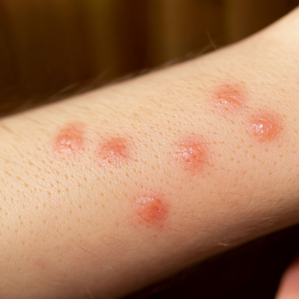 Bed Bug Bite: Bed bugs usually leave a series of bites on exposed skin (arms, neck, face). The bites appear as red, swollen spots with mild itching that can intensify over hours or days.