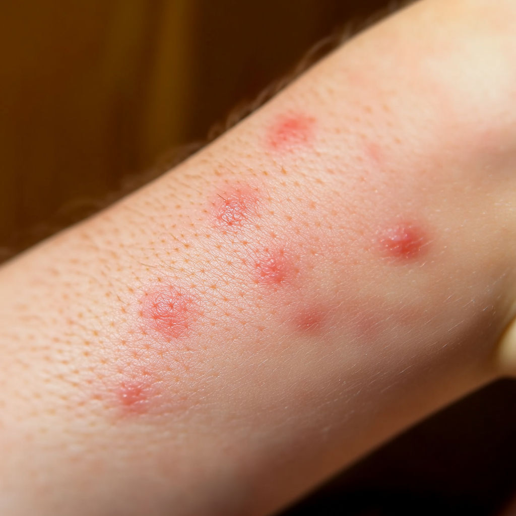 Bed Bug Bite: Bed bugs usually leave a series of bites on exposed skin (arms, neck, face). The bites appear as red, swollen spots with mild itching that can intensify over hours or days.