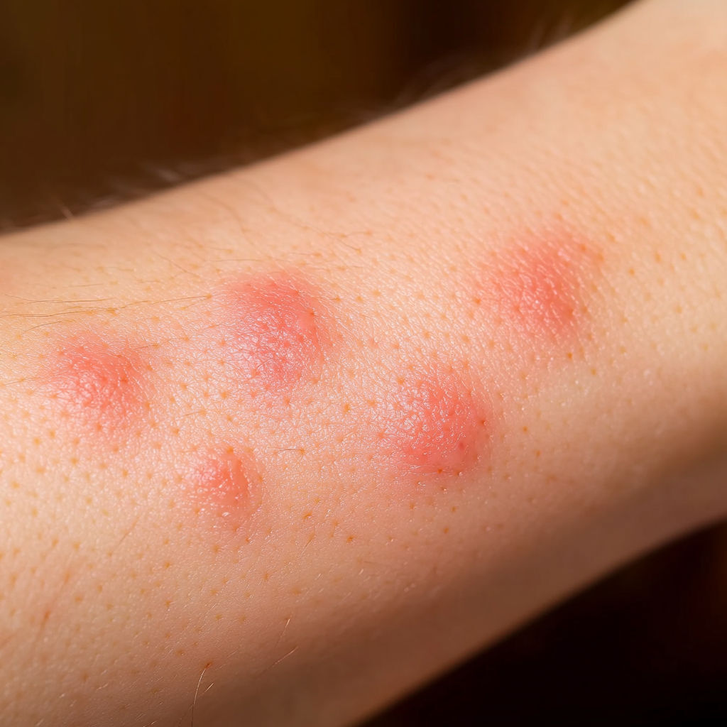 Bed Bug Bite: Bed bugs usually leave a series of bites on exposed skin (arms, neck, face). The bites appear as red, swollen spots with mild itching that can intensify over hours or days.