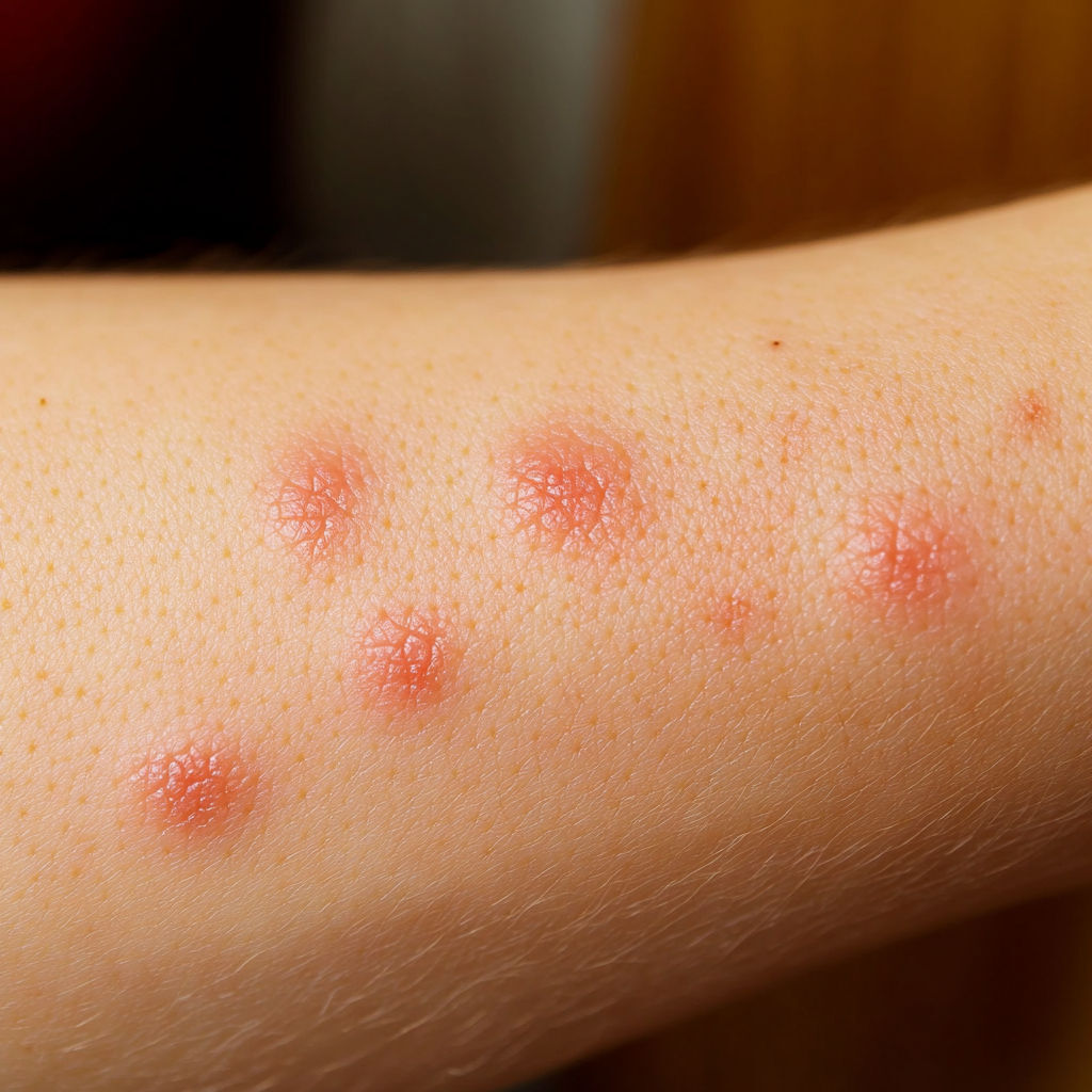 Bed Bug Bite: Bed bugs usually leave a series of bites on exposed skin (arms, neck, face). The bites appear as red, swollen spots with mild itching that can intensify over hours or days.
