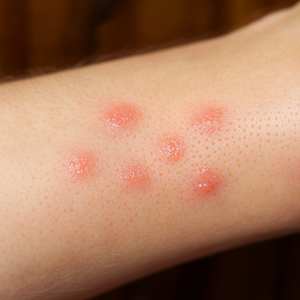 Bed Bug Bite: Bed bugs usually leave a series of bites on exposed skin (arms, neck, face). The bites appear as red, swollen spots with mild itching that can intensify over hours or days.