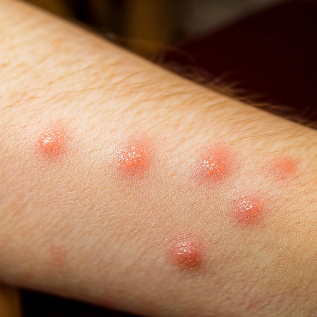 Bed Bug Bite: Bed bugs usually leave a series of bites on exposed skin (arms, neck, face). The bites appear as red, swollen spots with mild itching that can intensify over hours or days.