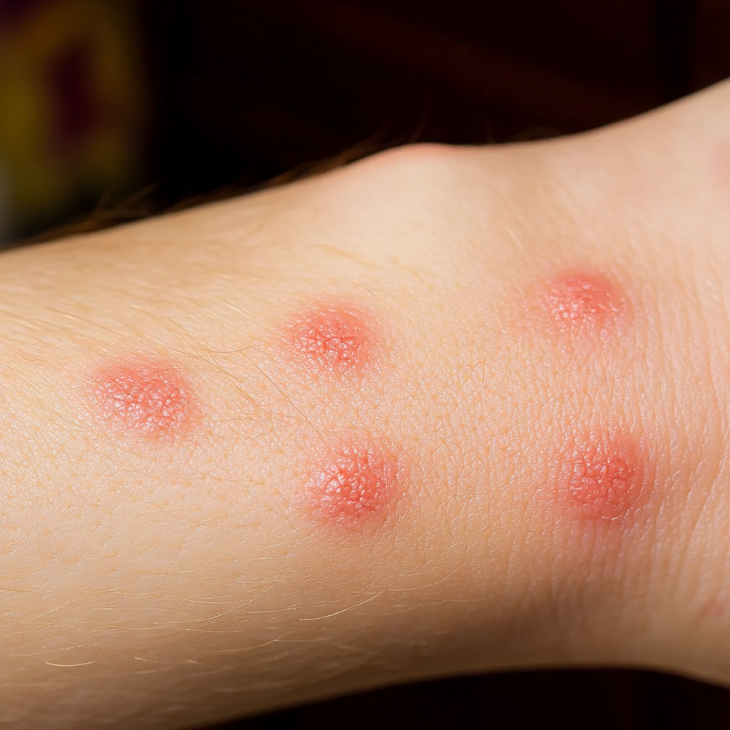 Bed Bug Bite: Bed bugs usually leave a series of bites on exposed skin (arms, neck, face). The bites appear as red, swollen spots with mild itching that can intensify over hours or days.