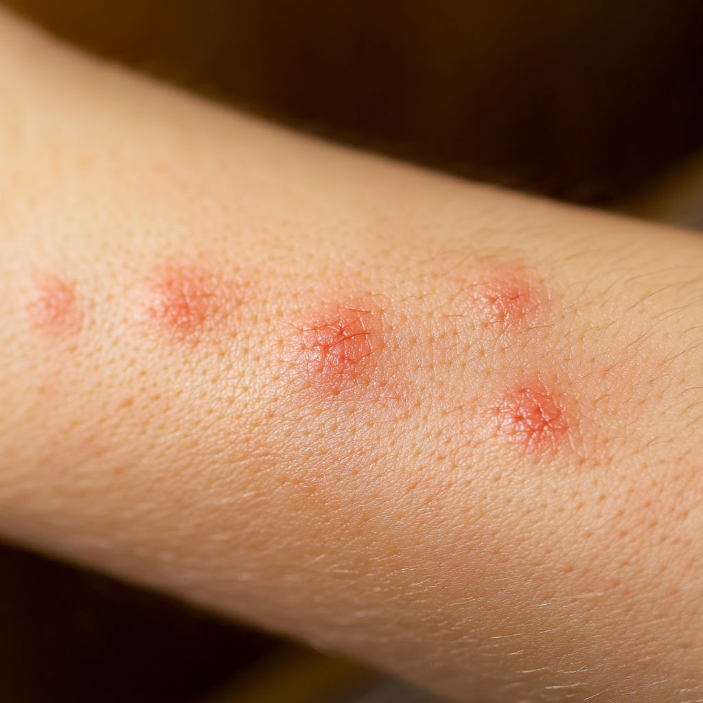 Bed Bug Bite: Bed bugs usually leave a series of bites on exposed skin (arms, neck, face). The bites appear as red, swollen spots with mild itching that can intensify over hours or days.
