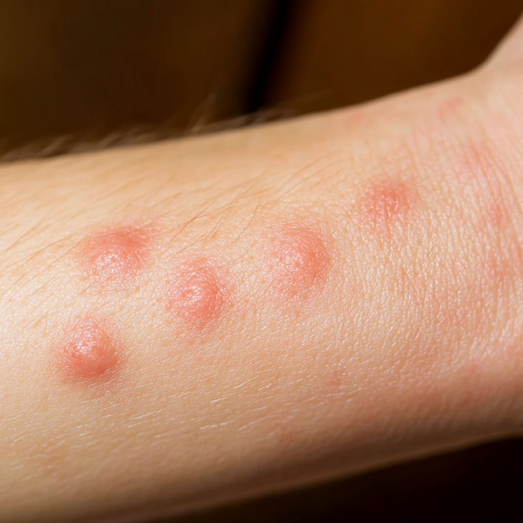 Bed Bug Bite: Bed bugs usually leave a series of bites on exposed skin (arms, neck, face). The bites appear as red, swollen spots with mild itching that can intensify over hours or days.
