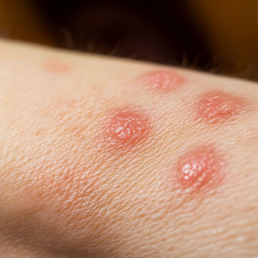 Bed Bug Bite: Bed bugs usually leave a series of bites on exposed skin (arms, neck, face). The bites appear as red, swollen spots with mild itching that can intensify over hours or days.