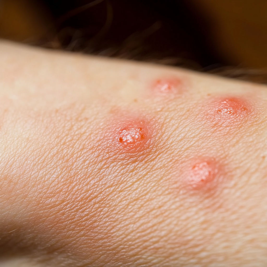 Bed Bug Bite: Bed bugs usually leave a series of bites on exposed skin (arms, neck, face). The bites appear as red, swollen spots with mild itching that can intensify over hours or days.