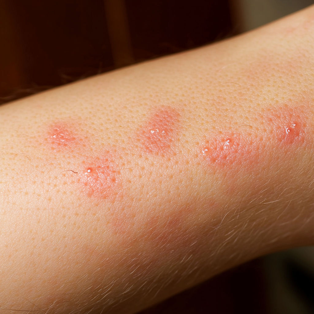 Bed Bug Bite: Bed bugs usually leave a series of bites on exposed skin (arms, neck, face). The bites appear as red, swollen spots with mild itching that can intensify over hours or days.