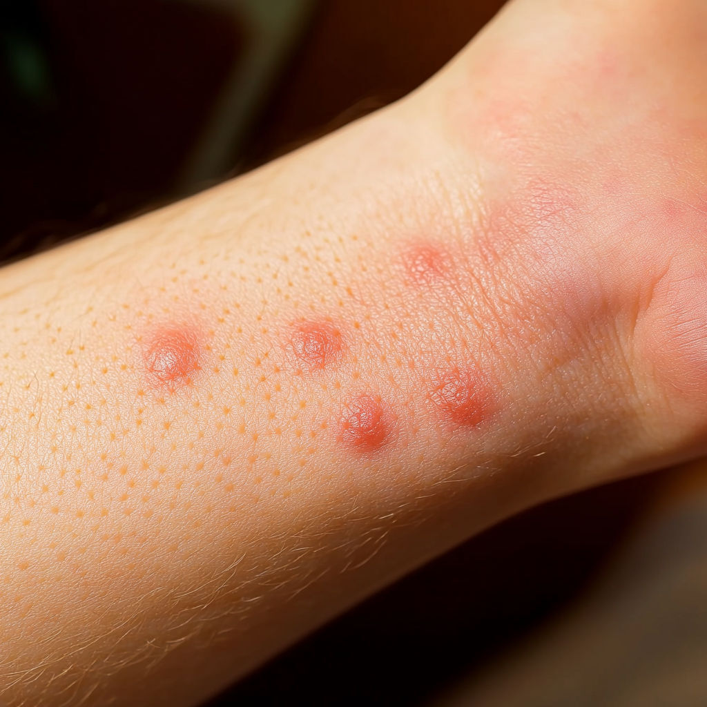 Bed Bug Bite: Bed bugs usually leave a series of bites on exposed skin (arms, neck, face). The bites appear as red, swollen spots with mild itching that can intensify over hours or days.