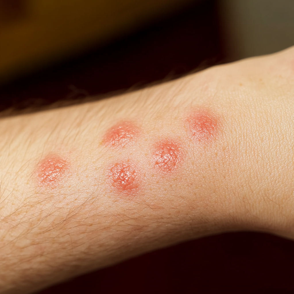 Bed Bug Bite: Bed bugs usually leave a series of bites on exposed skin (arms, neck, face). The bites appear as red, swollen spots with mild itching that can intensify over hours or days.