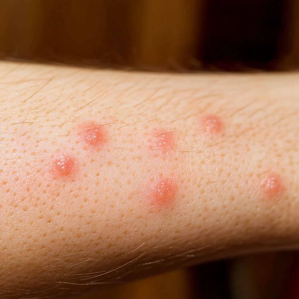 Bed Bug Bite: Bed bugs usually leave a series of bites on exposed skin (arms, neck, face). The bites appear as red, swollen spots with mild itching that can intensify over hours or days.