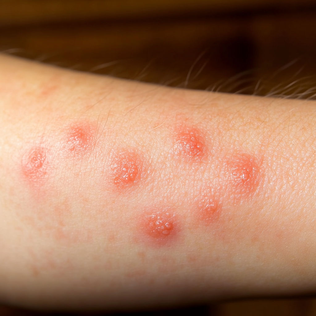 Bed Bug Bite: Bed bugs usually leave a series of bites on exposed skin (arms, neck, face). The bites appear as red, swollen spots with mild itching that can intensify over hours or days.