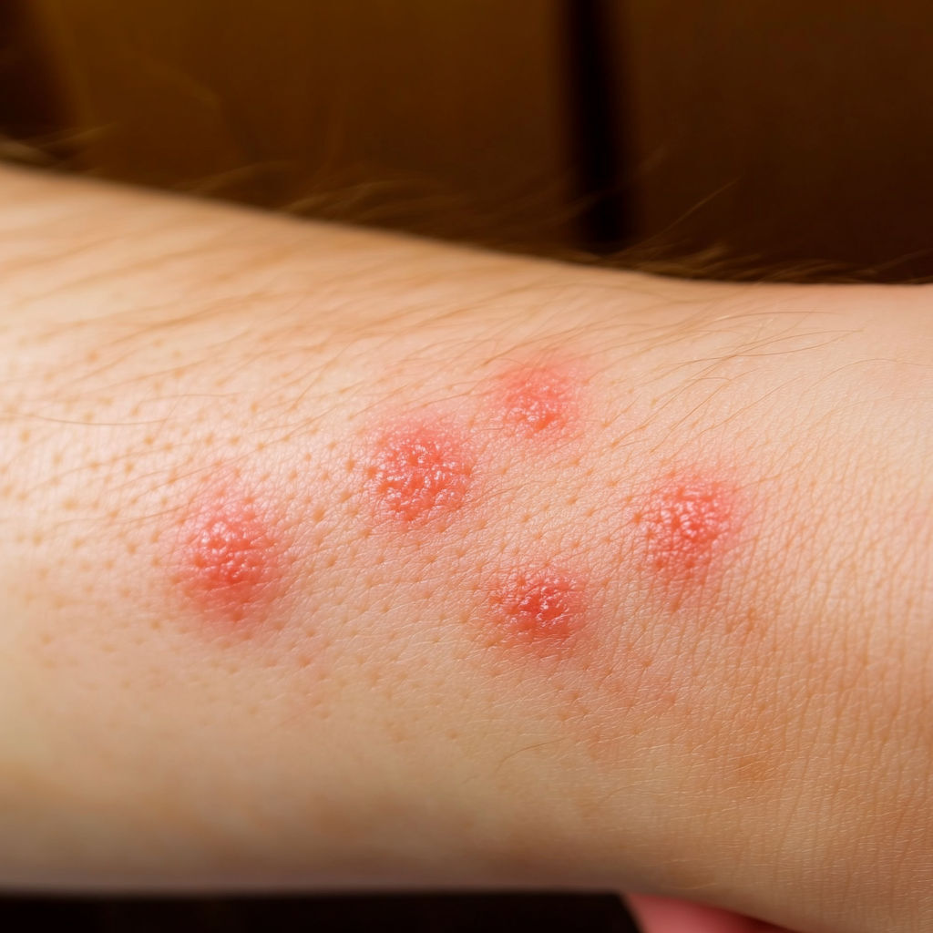 Bed Bug Bite: Bed bugs usually leave a series of bites on exposed skin (arms, neck, face). The bites appear as red, swollen spots with mild itching that can intensify over hours or days.