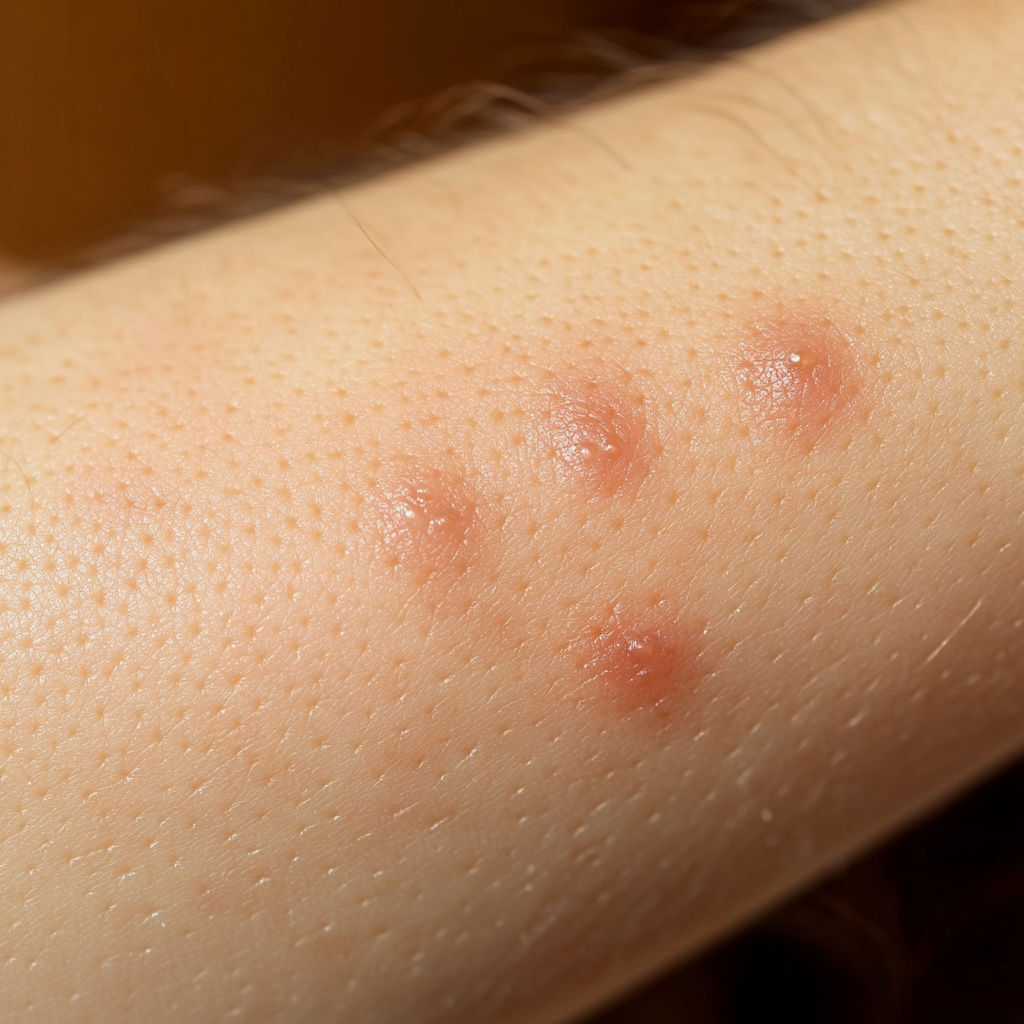 Bed Bug Bite: Bed bugs usually leave a series of bites on exposed skin (arms, neck, face). The bites appear as red, swollen spots with mild itching that can intensify over hours or days.