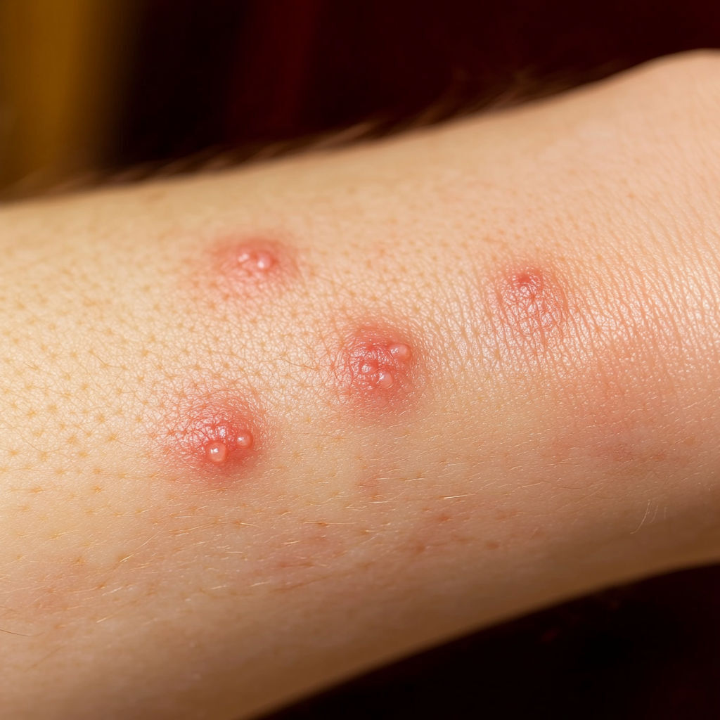 Bed Bug Bite: Bed bugs usually leave a series of bites on exposed skin (arms, neck, face). The bites appear as red, swollen spots with mild itching that can intensify over hours or days.
