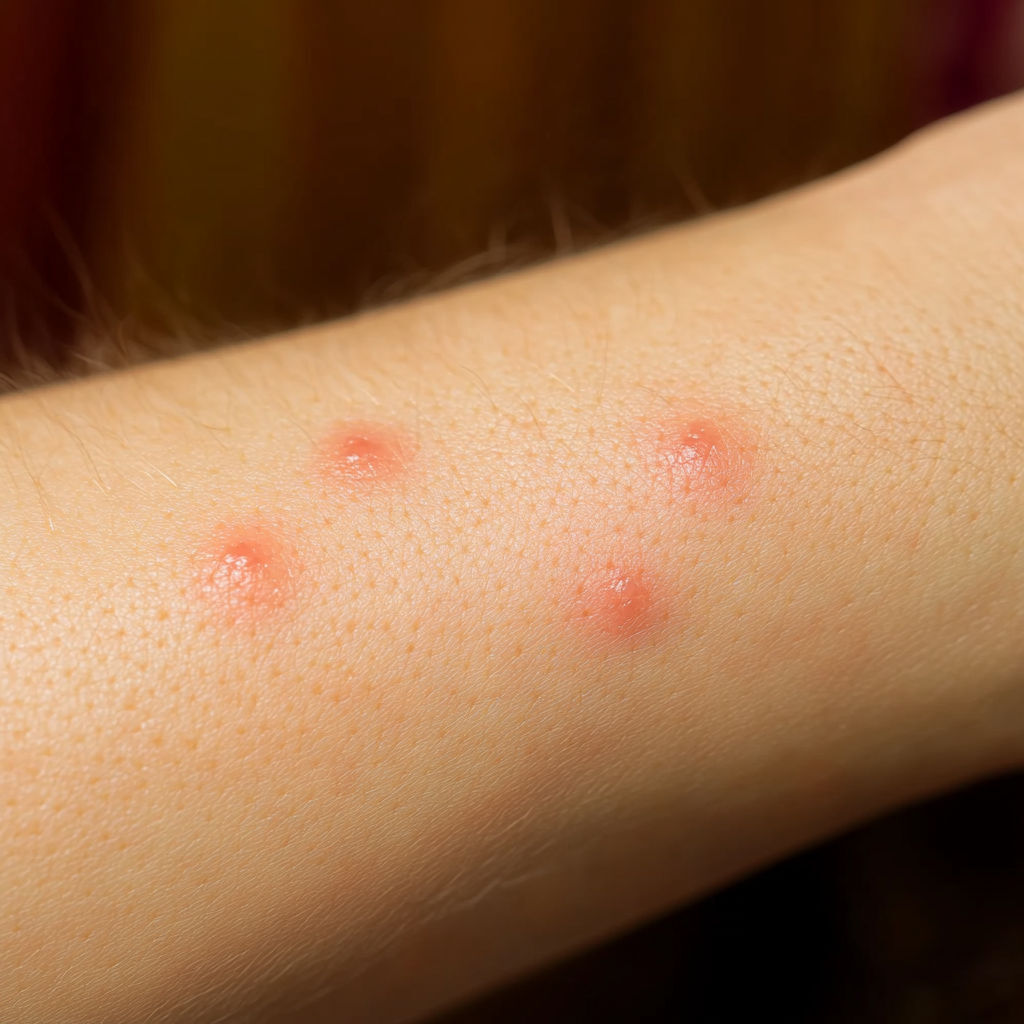 Bed Bug Bite: Bed bugs usually leave a series of bites on exposed skin (arms, neck, face). The bites appear as red, swollen spots with mild itching that can intensify over hours or days.