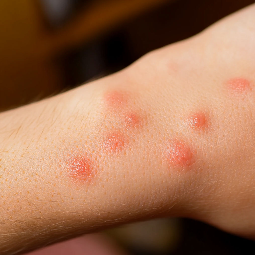 Bed Bug Bite: Bed bugs usually leave a series of bites on exposed skin (arms, neck, face). The bites appear as red, swollen spots with mild itching that can intensify over hours or days.